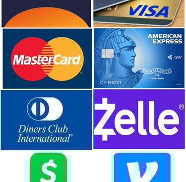 We accept various payment methods, including credit cards, checks, electronic payments via Zelle, Cash App and Venmo as well as bank transfers. Payment terms will be outlined in your contract, and we work with you to ensure a convenient payment process.